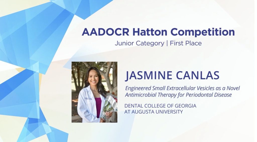 Canlas first won the American Association for Dental, Oral, and Craniofacial Research (AADOCR) Hatton Competition Junior Category, then advanced to the global stage to claim first place in the prestigious IADR Hatton Competition. Established in 1953, the award is the organization’s oldest honor recognizing emerging investigators.